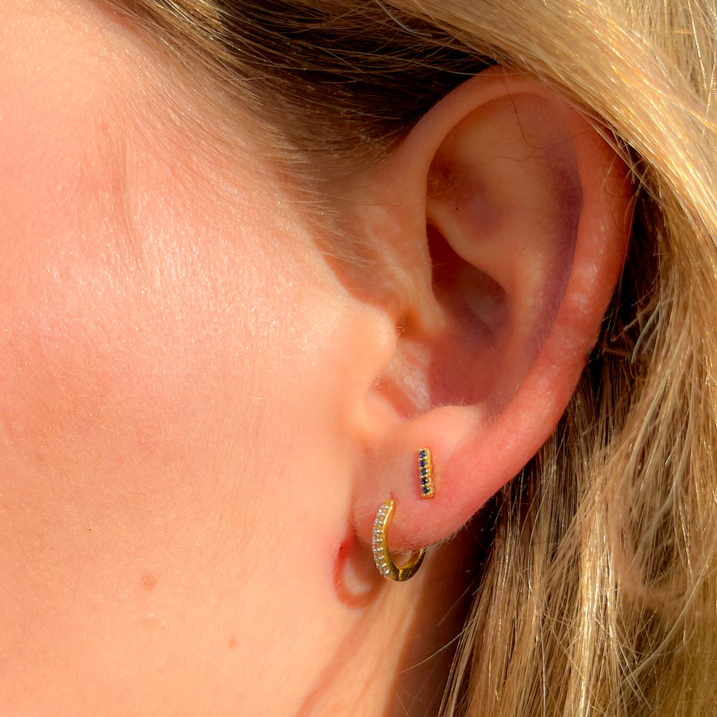 Transform your style with Mini Huggie, featuring dazzling pavé white topaz. Embrace your daring side and add a touch of luxury to any outfit. The natural white topaz adds a touch of sparkle and brilliance to your look. Take risks and stand out with the Mini Huggie.