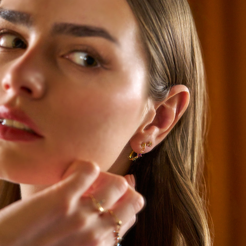 Dazzle in our exquisite Hoops adorned with Pink Tourmaline, Amethyst and Sky Topaz, all set in luxurious 18K Gold. A stunning fusion of elegance and color.